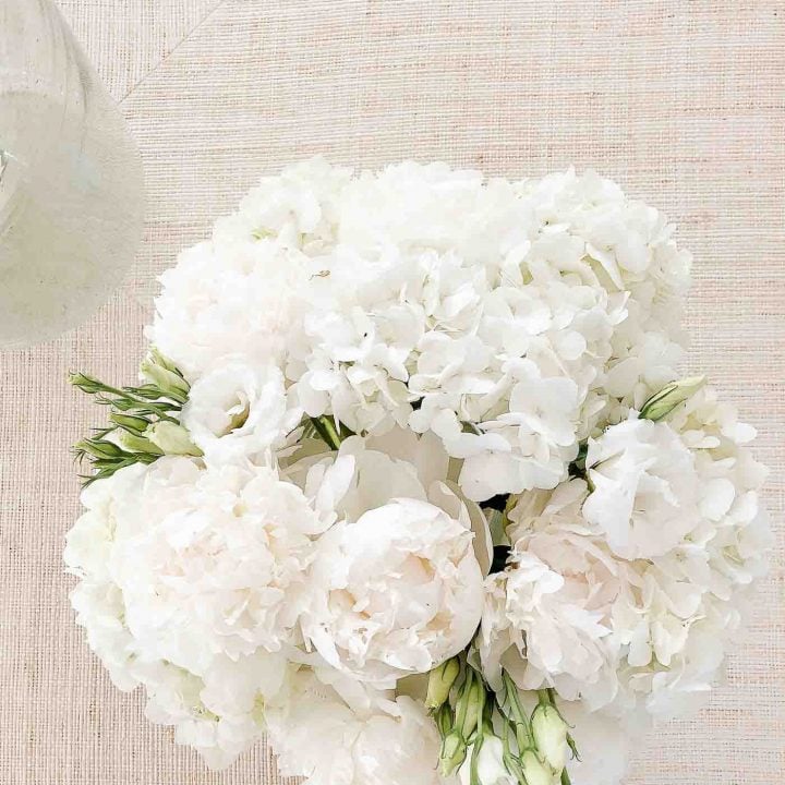 Hydrangea centerpieces are just so easy to design. I just remove the leaves that will fall below the top of the vase, cut to fit and voila! I have an arrangement. It doesn’t get any easier.