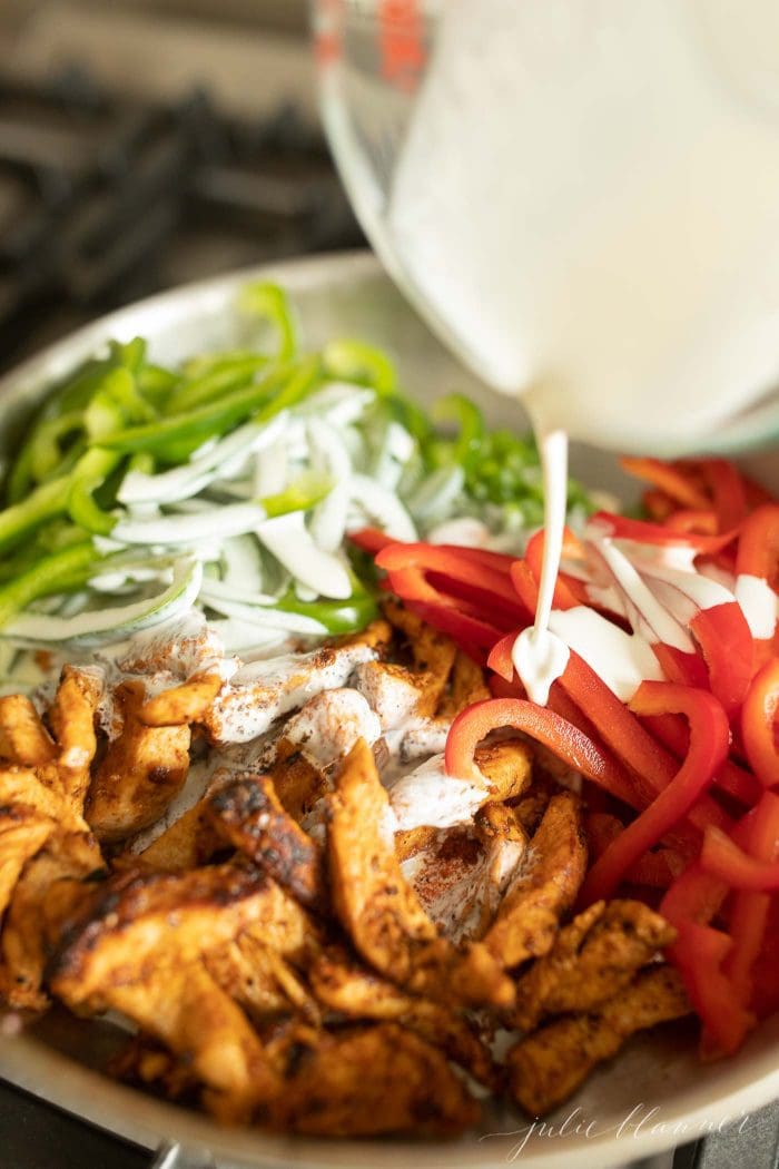 - Add your peppers and a little olive oil to your saute pan on medium heat. Once the peppers begin to soften, add garlic, spices and green onions. Then add heavy cream.