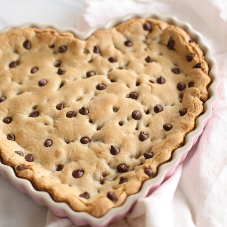 The girls and I have decided that we might just prefer thick, chewy cookie cake over individual cookies. A pretty heart dish never hurts either!
